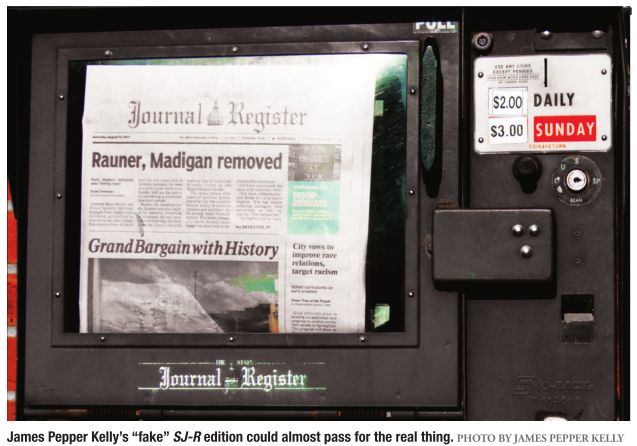 For a few weeks earlier this summer, Chicagobased artist James Pepper Kelly became a temporary fixture at area coffee houses and bars, picking local denizens’ brains about their hopes, dreams, concerns and stories revolving around the city of Springfield. Kelly was one of the first artists to participate in the Springfield Art Association’s recently minted Residency for Visual Artists program and when he wasn’t interacting with townies he was deep in research at Lincoln Library or poring through public records. He was back in town Sunday to distribute the end product of his time here – a convincing-looking replica of the State Journal-Register that reads like a broadsheet from an alternate universe featuring the near-utopian front page headline “Rauner, Madigan removed.”
