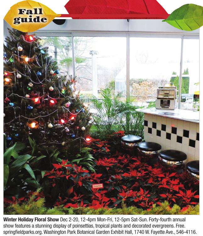 Winter Holiday Floral Show Dec 2-20, 12-4pm Mon- Fri, 12-5pm Sat-Sun. Forty-fourth annual show features a stunning display of poinsettias, tropical plants and decorated evergreens. Free. springfi eldparks.org. Washington Park Botanical Garden Exhibit Hall, 1740 W. Fayette Ave., 546-4116.