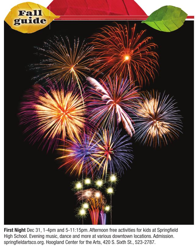 First Night Dec 31, 1-4pm and 5-11:15pm. Afternoon free activities for kids at Springfi eld High School. Evening music, dance and more at various downtown locations. Admission. springfi eldartsco.org. Hoogland Center for the Arts, 420 S. Sixth St., 523-2787.