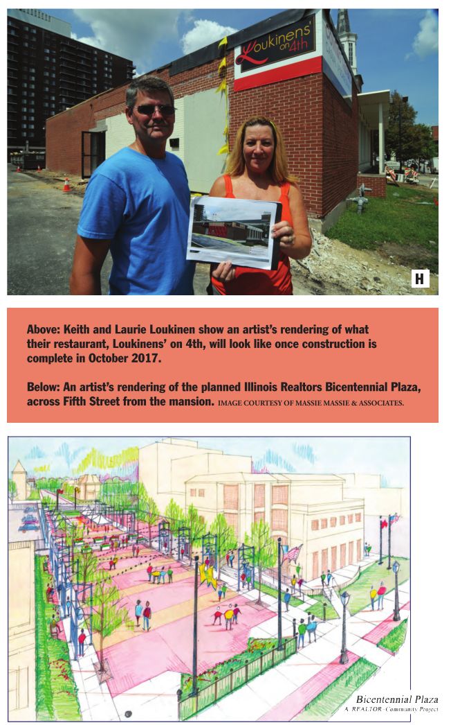 Illinois REALTORS®, the mansion’s neighbors to the east, have already publicized their plans for a new $2.6 million Bicentennial Plaza that will link Fifth and Sixth streets with a multiuse pedestrian mall, extending the Jackson Street corridor to the Lincoln Home area. The first visible sign of work on the plaza should come in the next month or so with the removal of an old bank branch building on Sixth Street. The plaza should be open in time to be part of Illinois Bicentennial activities in August 2018.