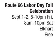 Hit the Mother Road this weekend and make the short jaunt to Elkhart for a party of epic proportions. Elkhart’s Route 66 Labor Day Fall Celebration offers two-days of jam-packed fun for the entire family. Friday’s festivities kick off with art sales at The Country Bumpkin, Birdsong Books & Vintage and Horsefeathers plus live music by the Lincoln Strings Trio. Dinner will be available for purchase at The Wild Hare Café from 5-8 p.m. Saturday’s fun begins at 8 a.m., with a biscuit-andgravy breakfast at the Fellowship Community Center. Other Saturday events include an all-day display of antique tractors, engines, motorcycles, bicycles and vintage classic cars; historic hill tours led by Bob McCue; a talent show; live mural painting; street food and blue plate specials for purchase; a street dance; BBQ and homemade pie contests; and more. Kids will enjoy performances by storyteller and musician Mike Anderson, creating sidewalk chalk drawings and make-and-take craft activities, plus a farm animal exhibition and petting zoo. For more information about the Route 66 Labor Day Fall Celebration in Elkhart, visit http://elkharthistoricalsociety.org.