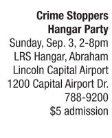Join CrimeStoppers for their second annual “Take Flight in the Fight against Crime” hangar party Sunday, Sept. 3, from 2-8 p.m. at LRS Hanger, located at Abraham Lincoln Capital Airport. The party features live music by The Deep Hollow from 2:30 through 4 p.m., and The Shenanigans from 4:30 through 8 p.m. Additional attractions include food for purchase from the Hy-Vee Market Grill and Field of Sweets food trucks plus beer, wine and other beverages, as well as the opportunity to peruse Dick Levi’s extensive classic car collection, available for public viewing one night only. Admission is $5, and event proceeds support CrimeStoppers of Sangamon and Menard Counties, a non-profit organization that pays cash rewards up to $1,000 for police tips that result in arrest. For more information about CrimeStoppers and “Take Flight in the Fight against Crime,” call 788-8427 or visit http://cashfortips.us.