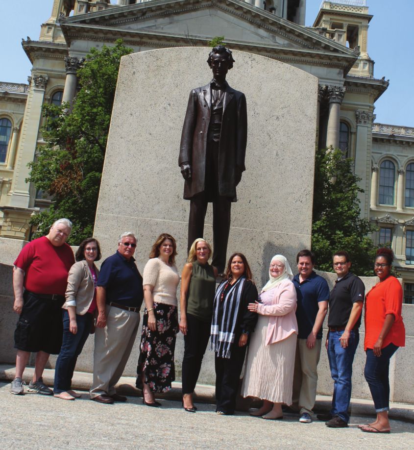 One way these often disparate groups keep themselves organized is through Springfield Call 2 Action, which holds frequent face-to-face meetings in addition to their online forums. The group is described on its Facebook page as “a coalition of local groups that share a commitment to justice, including racial, religious, social, gender, environmental, sexual orientation and economic.” According to Erik Hostetter, who helps administer Springfield Call 2 Action, “one thing about having a large and active coalition is that we don’t agree on every issue all the time – that’s to be expected and Members of the Springfi eld Call 2 Action coalition, left to right: Don Todd (AFSCME Retirees Sub Chapter 86 and Alliance for Retired Americans), Rianne Hawkins (Planned Parenthood of Illinois), Jim Dixon (president of Central Illinois Trades and Labor), Jennifer Camille Lee (Action Illinois), Ward 6 Alderman Kristin DiCenso (Women Rising), Veronica Espina (Springfi eld Coalition on Dismantling Racism), Maryam Mostoufi (Greater Springfi eld Interfaith Association; Islamic Society of Greater Springfi eld), Dave Amerson (About Face: Veterans Against the War), Erik S.