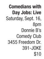 Join local comedians Jeremy Hughes and Larry Smith on Saturday, Sept. 16, at 8 p.m., for a live performance and recording session of their popular podcast, “Comedians with Day Jobs.” During their podcast, which is hosted by SoundCloud, the lively, relatable duo joke about the ins and outs of the lives of, in the words of Jeremy Hughes, “comedians who are not very good at being comedians, so therefore we still have to have day jobs.” Saturday’s live recording and performance will be followed by a Q-and-A session. Admission is $10, and advance tickets are available by calling Donnie B’s Comedy Club at 391-JOKE. For more information about “Comedians with Day Jobs,” including all podcast episodes, visit http://soundcloud.com/comedianswithdayjobs or find “Comedians with Day Jobs” on Facebook. See also