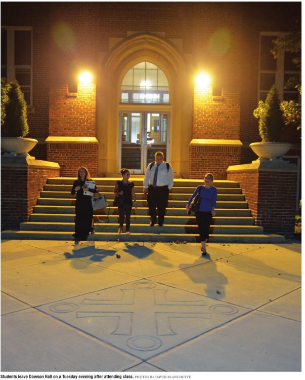 The campus lot and North Fifth Street were filled with parked cars. Lights glowed from campus buildings and shadows danced as students moved through hallways. Bookand-satchel-laden students hit the exit doors and headed into the evening after their marathon class sessions concluded.