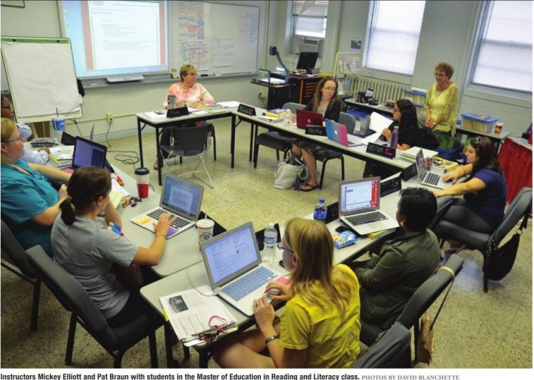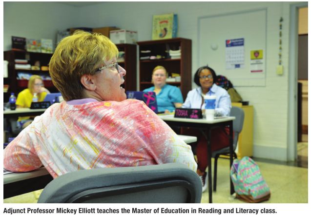 “I couldn’t get this type of program anywhere else that’s close by, and at the bigger universities tuition is so high,” Borders said. “My daughter just started preschool this year so she’s like, ‘Oh, mommy’s going to school just like me.’” Coe, Borders and their fellow Reading Master’s students gathered one recent Tuesday evening in their Dawson Hall classroom. Many used laptops, some took written notes, and all were identified by colorful nameplates of the type you might find in the classrooms where they all teach during the day. The instructor, a fellow teacher, spoke to them as experienced equals.
