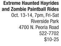 A favorite fall haunting event is back and spookier than ever. Don’t miss Riverside Stables’ Extreme Haunted Hayrides and Zombie Paintball Rides every Friday and Saturday night through Oct. 28. During the zombie paintball ride, guests board a double-decker trailer and travel deep into the woods to shoot at live zombie characters and targets. (Guests shoot at the zombies; the zombies do not shoot at guests). The hearse-pulled hayride is a fun ride filled with scares and surprises that moves guests along the river and deep into the woods. Other nightly attractions include a bonfire, DJ and concessions. Gates open at 6 p.m., and rides begin at 7 p.m. Ticket sales are cash only and end at 11 p.m. nightly. Hayride admission costs $10, with an express (skip-theline) option available for $15. Paintball rides cost $20, and a combination ticket for hayrides and paintball costs $25. This is an outdoor event, so all dates are weather-pending. For more information about the Extreme Haunted Hayrides and Zombie Paintball Rides, visit http://riversidestable.com. See also