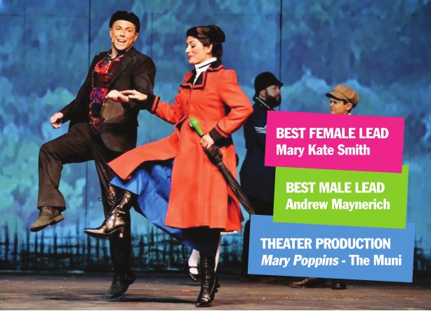 Well, what can you say about this clean BoS sweep other than lots and lots of folks really liked the Muni’s “practically perfect,” midsummer production of Disney’s theater version of Mary Poppins. From the extremely well-designed sets to the flying Mary and other tricks of “magic” necessary for pulling off a show of this caliber, the Muni crew took the good nanny’s saying, “Anything can happen, if you let it!” to heart and to the stage. Under the steady and experienced direction of Craig Williams II, ably supported by producer Whitney Rose, assistant director Seth Wheeler, apprentice director Stacy Kolaz; vocal director Christie Lazarides, choreographer Zoey Zara and a cast and crew of many, the snazzy production proved a sure winner backed by solid players and a known storyline. Popular and experienced local stage stars, Gus Gordon (Mr. Banks) and Mary Kate Smith (Mary Poppins), took the best in the leads, playing their respective roles like they were born for the parts. Andrew Maynerich as Bert came in one vote behind in the male lead voting, so we thought in the spirit of being practically perfect, he should be included in the winner’s circle.