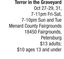 2017 marks 25 years of haunting for Terror on the Square, and they have truly outdone themselves with Terror in the Graveyard, their most intense show yet! Located just one mile north of Petersburg, at the Menard County Fairgrounds, Terror in the Graveyard is a haunted outdoor attraction where attendees stroll through an abandoned cemetery and through unforgettable, creepy and realistic scenes in the haunted woods. Since Terror in the Graveyard is an outdoor haunting event, attendees are asked to wear appropriate footwear and clothing. Admission to Terror in the Graveyard costs $13 for adults and $10 for ages 13 and under. For more information, visit http://terrorontheweb.com.