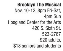 Don’t miss Brooklyn The Musical, a story within a story about a troupe of street performers, five homeless musicians known as the City Weeds, who perform theater pieces via a makeshift stage on a street corner located underneath the Brooklyn bridge. During Brooklyn the Musical, the City Weeds perform a play about a young Parisian singer named Brooklyn, who has come to the U.S. as an orphan in search for her absentee father. Brooklyn The Musical, sponsored by Ashley Coker of the Real Estate Group, runs November 10-12, with show times at 8 p.m. on Friday and Saturday and 4 p.m. on Sunday. Admission costs $20 for adults and $18 for students and seniors over age 60. To purchase tickets to Brooklyn The Musical, visit http://hcfta.org or call the Hoogland’s box office at 523-2787. See also