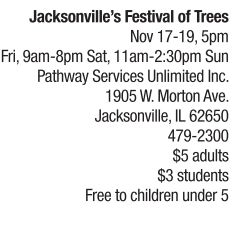 Enjoy a long-standing Jacksonville tradition from a new location as Jacksonville’s annual Festival of Trees has relocated from Woodhaven Hospice to Pathway Services Unlimited. The three-day festival showcases designer Christmas trees, wreaths and other holiday decorations plus live, local entertainment and a gift shop featuring holiday décor, plus cookies and candy handmade by Pathway residents. Additionally, children’s activities, such as Santa letter-writing stations, cookie decorating, holiday décor-making stations, and visits with Santa will be available all three days of the festival. Concessions such as hot dogs, chilli, sloppy Joes and nachos will be available for purchase on-site. The traditional auction of trees, wreaths and centerpieces will be held at the conclusion of the festival on Sunday, Nov. 19, at 2:30 p.m. For more information about Jacksonville’s Festival of Trees, call 479-2300. See also