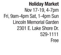 Kick off your holiday season with a special Thanksgiving and Christmas shopping event at the Lincoln Memorial Garden Nature Center, home to the Split Rail Shop. The annual holiday market features handcrafted items made over the past couple of months from area artisans, such as centerpieces, swags, wreaths, one-of-a-kind tree ornaments and more. Early bird shoppers are invited to partake in special evening hours on Friday, Nov. 17, from 4 p.m. through 7 p.m. Light refreshments, wine and cider will be offered to shoppers on Friday only. Regular market hours run from 9 a.m. through 4 p.m. on Saturday and 1 p.m. through 4 p.m. on Sunday. Admission is free, and all proceeds from the holiday market support educational programming at Lincoln Memorial Garden. For more information about the holiday market and Lincoln Memorial Garden visit http://lincolnmemorialgarden.org. See also