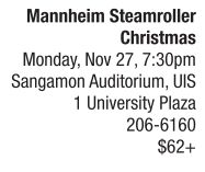 Join the multi-platinum American Gramophone recording artists known as Mannheim Steamroller on Monday, Nov. 27 to celebrate the start of the holiday season, the 30-year anniversary of the first Mannheim Steamroller Christmas album, and the 40-year anniversary of Grammy Award-winner Chip Davis’ first Fresh Aire album. The live show by Mannheim Steamroller, the talented group that blends classical music with elements of new age and rock music, features modern iterations of Yuletide favorites with dazzling multimedia effects in a show you won’t want to miss. Tickets start at $62 for the concert, and tickets to a pre-show event featuring a reception at 5:30 p.m. and a dinner at 6 p.m. are available for an additional $32. To purchase tickets to Mannheim Steamroller Christmas, visit http://sangamonauditorium.org or call the box office at 206-6160.