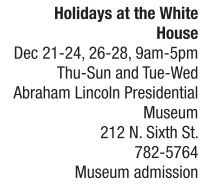 Learn how past presidents celebrated holidays during the newest exhibition at the Abraham Lincoln Presidential Museum, titled “Holidays at the White House: A Presidential Christmas.” The exhibit, which opened Nov. 17 and runs though Dec. 31, showcases photos, videos and artifacts from the Dwight Eisenhower, John F. Kennedy, Bill Clinton and George W. Bush administrations. Highlights include a model of Lincoln’s Springfield home made for the Bush administration, photographs of the Kennedy family celebrating their last Christmas together, and holiday videos shot from the vantage point of George W. Bush’s dog, Barney. Admission to the Abraham Lincoln Presidential Library and Museum is $15 for adults, $12 for seniors and students (valid school or college ID required), $10 for military, $5 for children ages 5-15, and free to children under five. For more information, visit http://illinois.gov/alplm. See also