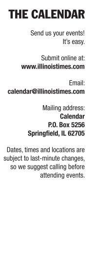 From Bluestems to Bluegills Super Saturday Jan 6, 11am-3pm Sat. Children ages 5 and up (and their families) enjoy crafts and activities while learning about the offi cial state symbols of Illinois. Free with admission. illinoisstatemuseum. org. 558-6696. Illinois State Museum, 502 S. Spring St., 782- 7386.