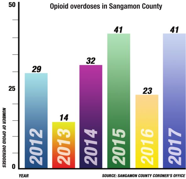 Forty-one people died of drug overdoses in Sangamon County last year that involved opioids, according to coroner records. That ties a record set in 2015, when 41 people also died from opioidrelated overdoses. The victims were mostly white. One dozen overdoses were caused by illicit drugs alone, the others included deaths from prescription drugs, a mix of prescription of illegal drugs and a combination of drugs and alcohol.