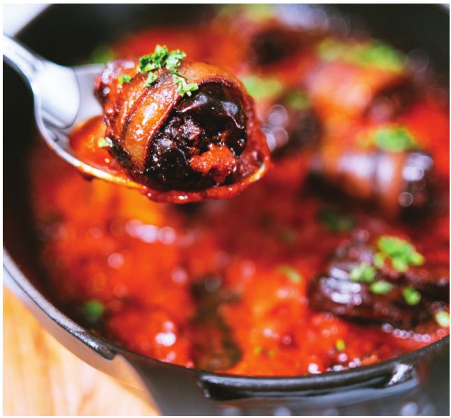 Heat the oven to 375 degrees. Remove the pits from the dates and stuff about 1 tablespoon of the chorizo into each date. Cut the bacon strips in half, and wrap half a piece around each stuffed date and secure with a toothpick. Bake on a parchment lined baking sheet for 18-20 minutes, until chorizo is cooked through and bacon is crisp. Serve with the pepper sauce and top with chopped parsley, alongside crusty bread.