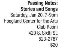 On Saturday, Jan. 20, take in an evening of stories and songs from songwriters Sally Barris, Amy Benton and Tom Irwin. Sally Barris is a sought-after Nashville songwriter who has penned music for Martina McBride, Kelli Pickler, Lee Ann Womack, Trisha Yearwood and others. Amy Benton, the organizer of this event, is a Taylorville native whose music has led her coast to coast in support of national acts and received airplay on Nashville’s WSM 650AM, the “most famed country music station in the world.” Tom Irwin is a local legend who has been performing in the central Illinois music scene for more than 35 years, a respected liaison between musicians and their audiences. Tickets to “Passing Notes: Stories and Songs” cost $20, and proceeds support the Springfield Area Arts Council. Advance tickets are recommended for this event. Tickets are available by phone at 523-2787 or online at http://hcfta.org.