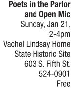 Join the Vachel Lindsay Association on Saturday, Jan. 21, from 2-4 p.m., for the first “Poets in the Parlor” event of 2018. The featured poet will be Tim Hunt, author of three poetry collections (Poem’s, Poems & Other Poems, The Tao of Twang, and Fault Lines) as well as an assortment of chapbooks. Hunt’s accolades include winning the Chester H. Jones National Poetry Prize, as well as three nominations for the Pushcart Prize. During this event, the Vachel Lindsay Association is excited to premiere a new tradition as part of their monthly “Poets in the Parlor” events: an open mic session from 2-3 p.m., to be followed by a reading from the featured poet from 3-4 p.m. For more information about Tim Hunt, Poets in the Parlor, and the Vachel Lindsay Association, visit http://vachellindsay.org.