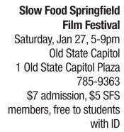 If you’ve ever wanted to learn more about the people, places and history behind the food you eat, this film festival is for you. The 10 th Annual Slow Food Springfield Film Festival will run from 5 through 9 p.m., on Saturday, Jan. 27, inside Foundation Hall at Springfield’s Old State Capitol State Historic Site. The festival kicks off at 5 p.m. with screenings of films from the Real Food Films library, the first-ever international celebration and collection of short films that highlight sustainable food and farming. A light dinner provided by chef Denise Perry of Copper Pot Cooking School along with coffee by Custom Cup Coffee will be available for purchase starting at 6 p.m., and a screening of America’s First Foodie: The Incredible Life of James Beard will take place at 7 p.m. For more information about the Slow Food Springfield Food Festival, visit http://slowfoodspringfield.org or call 341-0398.