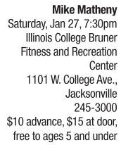 Hear a presentation by St. Louis Cardinals manager Mike Matheny on Saturday, Jan. 27, 7:30 p.m., inside the Sherman Gymnasium at Illinois College’s Bruner Fitness and Recreation Center. Matheny, who is about to enter his seventh season of management with the St. Louis Cardinals, will share stories from his career as a player and coach, insight to the Cardinals organization, and answer audience questions during a post-presentation Q&A session. Additionally, a silent auction featuring Cardinals memorabilia will be held in the center’s main concourse before and during the event. Tickets cost $10 in advance or $15 at the door and are free to children ages 5 and under. Advance tickets can be purchased online at http:// bit.ly/2BiS8os, and questions may be directed to 245-3112. See also