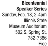 This Sunday, join the Academy of Lifelong Learning at Lincoln Land Community College and the Illinois State Museum for the first of nine Bicentennial Speaker Series programs in honor of the Illinois Bicentennial. The series kicks off with a presentation by Illinois State Historian Dr. Samuel Wheeler titled “Two Centuries to Celebrate: Illinois at the Bicentennial.” During his presentation, Wheeler will discuss some of the ways in which the state of Illinois has celebrated milestone anniversaries, such as statehood in 1818, the centennial in 1918 and the 1968 sesquicentennial. Additionally, Wheeler will preview a handful of the ongoing bicentennial plans, as well as what helps make our state unique and how to best celebrate the 200 th birthday of Illinois. The complimentary Bicentennial Speaker Series will host a speaker on the third Sunday of every month, from February to October, and will feature several Road Scholar Speakers offered by Illinois Humanities. For more information about the Bicentennial Speaker Series, call 782-0979 or visit http://illinoisstatemuseum.org. See also