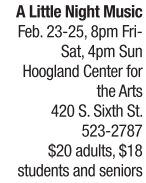 Hoogland Productions is proud to present the final three performances of A Little Night Music, directed by Joe-Michael Jackson. A Little Night Music is the four-time Tony Award-winning musical written by Stephen Sondheim, Hal Prince and Hugh Wheeler, based off Ingmar Bergman’s comedy of manners titled Smiles of a Summer Night. The story, set in Sweden in the 1900s, follows the tangled web of affairs surrounding actress Desiree Armfeldt and the men who love her, and showcases one of Sondheim’s most popular songs, “Send in the Clowns.” Tickets cost $20 for adults and $18 for students and seniors over 60. Tickets can be purchased in advance online at http://hcfta.org or by calling the Hoogland’s box office at 523-2787. See also