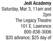 Children ages 4 and up are invited to learn the ways of the Jedi on Saturday, Mar. 3 with Master Jedi Panniken Moonjumper, played by family entertainer and Pirate School creator David Engel. During a training session with the Master Jedi, young Jedi will enjoy comic antics, exciting physical challenges, magical mayhem, lightsaber lessons, a visit with Chewbacca, and, most importantly, gain the courage and vision to combat the most sinister Dark Force: youth bullying. Emphasis will be placed on developing skills such as the power of observation, the strength of character, and mind, body and personal courage. Says Scott Richardson, director of the Legacy Theatre, “Our audiences loved Pirate School, and we loved the way David’s silly, gentle spirit connects with our young audiences. His work incites curiosity, empathy and empowers our increasingly distractible youth.” Tickets to Jedi Academy cost $20 in advance, and can be purchased for $25 the day of the show. More information about Jedi Academy and the Legacy Theatre can be found online at http://atthelegacy.com or by calling 800-838-3006.