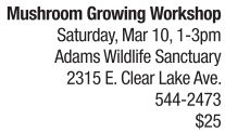 Learn how to grow your own shiitake and oyster mushrooms and receive all necessary supplies to do so, including inoculated shiitake and oyster logs, during this exciting presentation on Saturday, March 10, at Adams Wildlife Sanctuary. The program, hosted by Friends of the Sangamon Valley, has a limited amount of space for attendees so early reservations are encouraged. The cost of the workshop is $25 per person and attendees are encouraged to bring a cordless drill and a hammer, if possible. Questions about this event and registration can be directed to Vern at 525-1410.