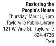 Learn all about the Illinois Executive Mansion, home to Illinois governors and their families since 1855, during a presentation by Justin Blandford, the superintendent of the state-owned historic sites in Illinois’s capital city. The mansion is scheduled to re-open in July 2018, following a meticulous, privately-funded restoration led by First Lady Diana Rauner, who, in 2015, described the decrepit and crumbling building as a metaphor for the state of Illinois. Blandford’s presentation will highlight future plans for the mansion and remind the audience of the history and significance behind the historic home. This event is free to the public, and is sponsored in part by the Illinois Humanities Road Scholar Speakers Bureau. For more information about this program and the Taylorville Public Library, call 824-4736. See also