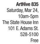 On Saturday, March 24, take in an art show featuring the artists of ArtHive835, a group of central Illinois-based artists, makers, fine craftsters and a poet. This newish art collective was created in March 2017 following their first art show, which was held at the Inn at 835. The show will feature work by more than 20 ArtHive835 member artists, including Cydne LaBonte, Meghan Tippy Reese, Christy Freeman, Kristin Diehl, Felicia Olin, M.E. Tumulty, Jeff Williams, Joan Burmeister and others. The spring art show will include a wide variety of media, such as paintings, drawings, batiks, leatherwork, woodwork, blown glass, pottery, jewelry, stained glass and more. For more information about ArtHive835, visit http://arthive835.com. See also