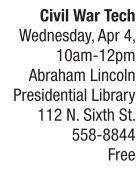 Enjoy a special mid-week Civil War Tech event on Wednesday, April 4, in celebration of many area schools being on spring break. Civil War Tech events provide hands-on activities for children ages 8-12 to explore the intersection between history and technology. April’s Civil War Tech event, titled “The Logistics of War,” will teach kids how troops, ammunition and supplies were moved from point A to point B; how Civil War armies crossed rivers and swamps; and how to build and test pontoon bridges and other bridges for sturdiness. This event is free to the public, and reservations can be made online at http://PresidentLincoln.illinois.gov. See also