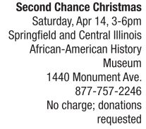 If you didn’t have the chance to travel the world during Christmas, you now have the opportunity to take an exciting journey through world cuisines during the Second Chance Christmas event on Saturday, April 14, from 3-6 p.m. During this event hosted by the Springfield and Central Illinois African-American History Museum, attendees will enjoy samplings of food from Africa, Asia, Australia, Europe, North America and South America and partake in celebrations and displays of diversity around the world via ethnic clothing, food and activities. For more information about Second Chance Christmas, as well as the Springfield and Central Illinois African-American History Museum, call 877-757-2246 or visit http://spiaahm.org. See also