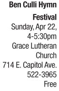 Come together with your community and sing praise to God during the Ben Culli Hymn Festival on Sunday, April 22. The festival is organized by Springfield native and Milwaukee-based organist and composer Ben Culli, and will feature traditional hymns performed with accompaniment by Ben Culli on the organ, violinist Jean Tweet and the Sangamon Brass concert band. The theme of this year’s festival is “Come, Hear the Word,” and is inspired by a hymn of the same name that was composed by Culli with words by Paul Hosea. This festival is a joint effort by Our Savior’s Lutheran Church and Historic Grace Lutheran Church. This event is free to the public, and canned food donations to Grace Food Pantry will be accepted. For more information about the Ben Culli Hymn Festival, contact Grace Lutheran Church at 522-3965. See also