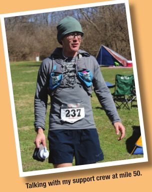 “Once the sun came out around 9 a.m., the course started to become pretty muddy, which made the whole thing a little more interesting. I think I changed my socks twice in the first four laps. I would get my feet completely submerged at the first creek crossing on every loop, which led to problems later on. My fiancée, Valerie, was on top of the aid station detail. My Mom, a couple of my aunts and my best friend, Ben Lazare, and his family also showed up at mile 50. It was great seeing everyone, and I really appreciated them coming to cheer me on.