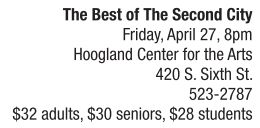 Chicago’s legendary sketch and improv comedy theater returns to the Hoogland Center for the Arts on Friday, April 27 at 8 p.m. with “The Best of The Second City.” This must-see show features the best sketches and songs from The Second City’s history made famous by superstars like Tina Fey, Stephen Colbert, Steve Carell, Gilda Radner, Bill Murray and more, as well as their trademark improvisation. Fresh, fast and always spectacularly funny, The Second City is celebrating nearly 60 years of producing cutting-edge satirical revues and launching the careers of generation after generation of comedy’s best and brightest. Tickets for The Second City are $32 for adults, $30 for seniors and $28 for students, and can be purchased at the Hoogland’s box office at 420 S. Sixth St. Tickets can also be purchased online at http://hcfta.org or by phone at 523-2787.