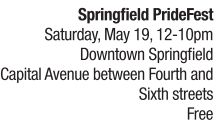 On May 19, Springfield Pridefest, the gayest celebration in town, returns for another year. The festivities kick off with a parade at 11:30 a.m., beginning at Fifth and Allen streets, leading north up Fifth Street to Jackson Street, and entering the Pridefest grounds via Capitol Street for a ribbon-cutting ceremony at noon. The afternoon will offer live music by Fun DMC, Thornhill and The Shenanigans, plus the much-anticipated annual drag show featuring some of the area’s top drag performers. Other attractions include more than 50 vendors offering a variety of information and wares, activities for children and teens including a DJ, karaoke and a teen drag show, plus food and drinks for purchase. PrideFest is open to all and free to attend. For more information about Springfield Pridefest, visit http://springfieldpride.org or call 528-5253. See also