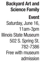 Take in a fun-filled afternoon of art and science activities during the Illinois State Museum’s “Backyard Art and Science Family Event” on Saturday, June 16, from 11 a.m. to 3 p.m. The rain-or-shine event showcases a variety of educational activities and demonstrations that kids ages 5 and up can recreate with their families in their own backyards, such as cloud studies, building habitats for wildlife, blowing bubbles and making art. The event will also feature a live animal display courtesy of Wildlife Prairie Park plus representation from Springfield’s Henson Robinson Zoo. The “Backyard Art and Science Family Event” is free with museum admission. Museum admission costs $5 for adults ages 19- 64 and is free to members, youth, seniors, military and veterans. For more information, contact [email protected] or call 558-6696.