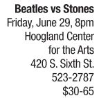 Don’t miss Beatles vs Stones, a high-energy musical showdown on Friday, June 29 at 8 p.m. at the Hoogland Center for the Arts. During this top-rated event, The Fab Four will be represented by Beatles tribute band Abbey Road while the Rolling Stones will be represented by Satisfaction, a Rolling Stones tribute band. Beatles vs Stones is a two-hour-long show broken into three sets each by each band, as well as one all-out encore performance featuring both groups. This concert features brilliant musicianship and authentic costumes, and gives fans the opportunity to see the boys next door and the bad boys of rock a’n’ roll “perform on the same marquee,” according to Chris Legrand, who performs as Mick Jagger in Satisfaction. Tickets to Beatles vs Stones cost $30-$65, and can be purchased online at www.hcfta.org or by calling 523-2787. See also