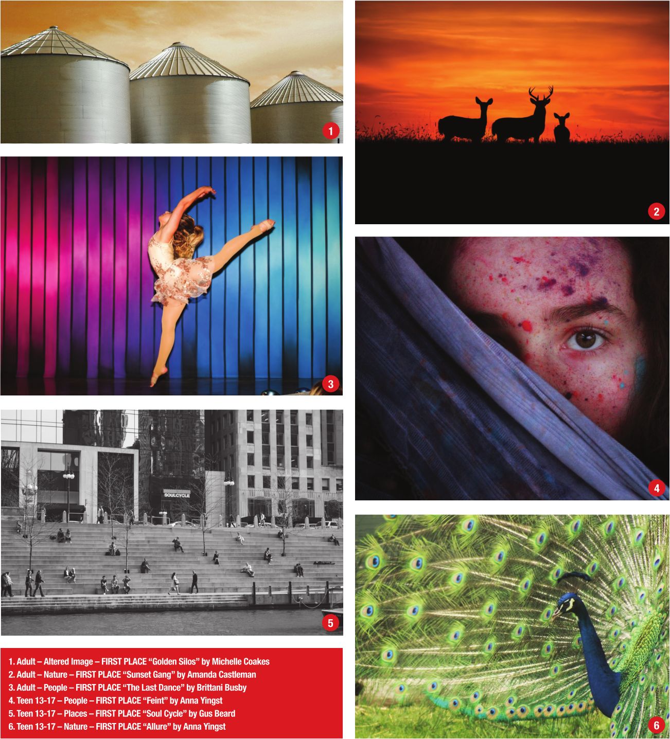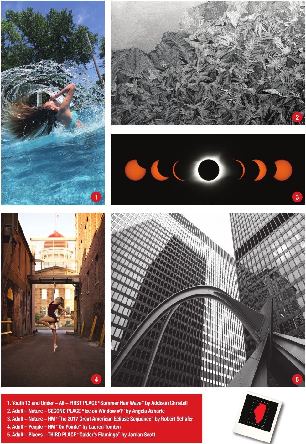 Adult – Places 1 – Cemetery, Sunlight, and Fog” by Michael Boehl 2 – “Splashes & Skyline” by Damon Shaw 3 – “Calder’s Flamingo” by Jordan Scott HM – “Girl Refl ection, Chicago” by Eric Newnam HM – “Sunset on the Marsh” by Marie Young