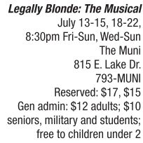 Don’t miss The Muni’s production of Legally Blonde: The Musical. Based on the Legally Blonde novel by Amanda Brown and the 2001 film by the same name, the musical contains music and lyrics by Laurence O’Keefe and Nell Benjamin plus a book by Heather Hach. The story follows Elle Woods, the quintessential Valley Girl who has it all – until her boyfriend, Warner, breaks up with her so that he can move to the East Coast and attend Harvard Law School. To win him back, Elle charms her way into the Ivy League institution and sets out to prove that she is more than just a pretty face. Legally Blonde: The Musical is directed by Anna Bussing Maisenbacher and features a local cast. For more information about Legally Blonde: The Musical, visit http://themuni.org or call 793-MUNI.