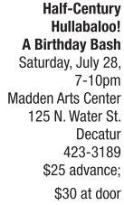 Celebrate the 50 th birthday of the Decatur Area Arts Council with a birthday celebration titled “Half- Century Hullaballoo! A Birthday Bash” on Saturday, July 28. This event, open to adults ages 21 and older, will feature typical birthday party elements with a timely twist, as all three floors of the Madden Arts Center will be decked out in the styles of the 1960s through the 2000s and will feature music, dancing, games, activities, party food, karaoke, costumes, a cash bar and more. Throughout the evening, attendees will be awarded prize tickets for participating in and supporting various party activities. Your chance of winning a prize at the end of the night will be determined by how much you embrace the fun! Tickets to the “Half-Century Hullaballoo” cost $25 in advance or $30 at the door, and can be purchased online at http://decaturarts.org or by calling 423-3189. See also