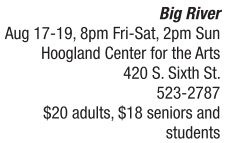 Catch the opening weekend of Big River, Mark Twain’s timeless tale of Huck Finn, who helps his friend, Jim, a slave, escape to freedom near the mouth of the Ohio River. Big River is driven by an award-winning score written by Roger Miller, the king of country music, and the resulting production is a brilliant theatrical celebration of Americana. Big River is presented by Hoogland Productions, directed by Rich McCoy and Joe-Michael Jackson, and features a talented local cast. Tickets to Big River cost $20 for adults and $18 for seniors and students. Tickets can be purchased by calling the Hoogland’s box office at 523-2787 or online at http://hcfta.org.