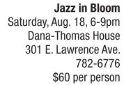 On Saturday, Aug. 18, enjoy an evening of live jazz music and refreshments in support of the education and preservation programs of the Dana- Thomas House Foundation. “Jazz in Bloom,” an event held in the tradition of Susan Lawrence Dana’s summer cocktail parties, will feature live jazz music by the Rob Killam Quartet, tours of the Dana- Thomas House, a silent auction, food by Arena Catering, plus a cocktail bar. Admission to “Jazz in Bloom” costs $60 per person and includes all food, drinks and entertainment. Requests for more information or advance reservations can be directed to 788-9452 or http://dana-thomas.org.