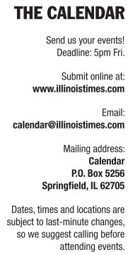 Art Spectacular Sep 8-9, 10am-5pm Sat, 10am- 4pm Sun. A multi-experience festival consisting of art, music and children’s programs. Featuring 50 regional and national artists. Free admission; kids’ place costs $2 per child. carillon-rees.org. 217-787-3532. Washington Park Botanical Garden, 1740 W. Fayette Ave., 217-546-4116.