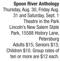 A cast of local actors and musicians is bringing Edgar Lee Masters’ Spoon River Anthology to New Salem’s Theater in the Park. Blending the voices of the cemetery “residents” with Americana folk music from local fatherdaughter duo Mark and Molly Mathewson, Spoon River Anthology is a poignant, breathtaking presentation of life in early 20 th century Menard, Fulton and Mason counties. Spoon River Anthology was written in 1915 by Petersburg native Edgar Lee Masters. The book of poems is set in a cemetery and features characters based on real people Masters knew while growing up in Petersburg and Lewistown. It recently was voted by IllinoisTop200.com as one of the top five books by Illinois authors. “Masters changed the names of the people he wrote about, but folks at the time knew exactly who they were,” said Phil Funkenbusch, director of the current production. “It’s also why many of the stories we hear are very relevant to us today. It’s what living in a small town is all about. This realism makes us laugh, and cry and even empathize with characters who lived right here a few generations ago.” Visit www.theatreinthepark.net or call 632-5440 for tickets and additional information.