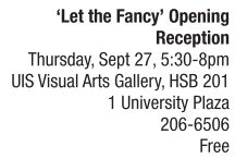 On Thursday, Sept. 27, attend the opening reception for “Let the fancy,” the new exhibition at the UIS Visual Arts Gallery that is inspired by the John Keats poem of the same name. The exhibition features mixed-media artworks by regional and national artists that assert the richness of “fancy” materials and designs juxtaposed in a testy and comical relationship with everyday objects. Featured objects by Matt Morris, Rose Nestler, Sherwin Ovid, Preetika Rajgahiah and Elise Warfield include bejeweled Budweiser cans, a custom fragrance that will be worn by UIS Visual Arts Gallery staff, fabric formalwear abstractions, a silky pink sari adorned with silky hair, fragmented crystals and more. “Let the fancy” is on display now through Oct. 18. The UIS Visual Arts Gallery is in the Health and Science Building and is open for visitors Monday through Thursday from 11 a.m. to 6 p.m. More information about the UIS Visual Arts Gallery is available online at http://uis.edu/visualarts/gallery or by phone at 206-6506.