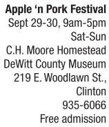 Celebrate the fall harvest during the annual Apple ‘n Pork Festival at the C.H. Moore Homestead DeWitt County Museum in Clinton. The family-friendly event, which began 50 years ago with a pot of soup and a stack of sandwiches, has expanded to become one of the most popular festivals in downstate Illinois. The festivities include more than 25 booths featuring apple and pork dishes, a juried art show, a large flea market, an antique tractor and farm equipment exhibition, Civil War interpreters, woodcarving and blacksmithing demonstrations, opportunities to tour the home of C.H. Moore (a law partner and close personal friend of Abraham Lincoln), live musical entertainment, pony rides, tomahawk throwing, a “Pigs on Parade” contest, and much, much more. Admission to the festival and flea market grounds is free, and more information is available online at http://chmoorehomestead.org or by calling 935-6066. See also