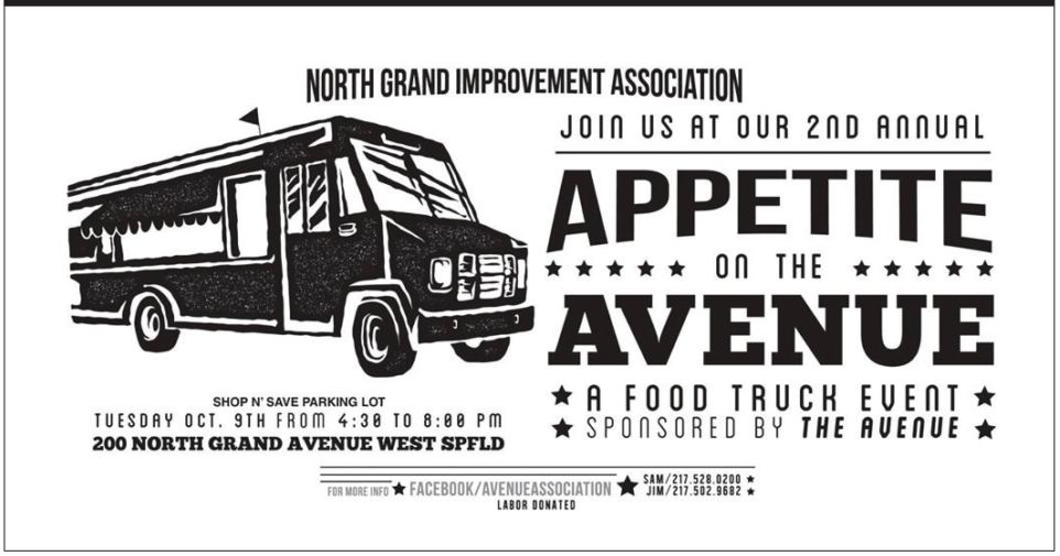 APPETITE ON THE AVENUE Taking place in Shop ’n Save’s vast parking lot on North Grand Avenue, just east of First Street from 4:30 to 8 p.m., Tuesday evening’s (Oct. 9) Appetite on the Avenue will be our second annual food truck event. Appetite on the Avenue will have food trucks, thirst-quenching local beer, great music by Tom Irwin, neighborhood camaraderie and more.