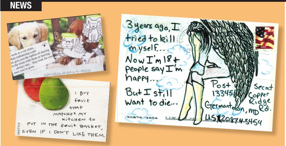 Warren had initially been terrified of public speaking but he says that witnessing the experiences of attendees of “PostSecret Live” around the world has forced him to get over himself. “I decided to try not to worry about my small concerns and embrace the larger message and the power of self-revelation and how it can connect us to others in meaningful ways,” he said. At the live events, he has seen things like surprise marriage proposals and sons and daughters sharing something they had previously never said out loud in front of their parents. “The audiences respond in ways that are very embracing,” he said. “It’s the antithesis of what you see typically on the web, all the snark and cynicism. It’s hopeful and embracing and celebrating our common and shared humanity.”